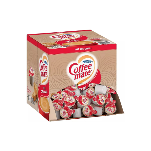 Non-dairy liquid creamer in Coffee-mate's original flavor. Comes in convenient, single-serve cups. No refrigeration needed
